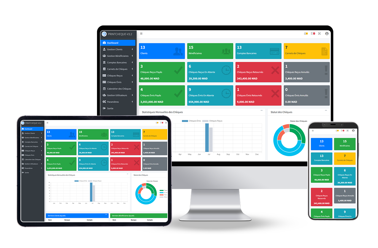 Outils avancés pour gérer toutes vos transactions bancaires et imprimer des chèques avec précision, compatible avec toutes les banques marocaines